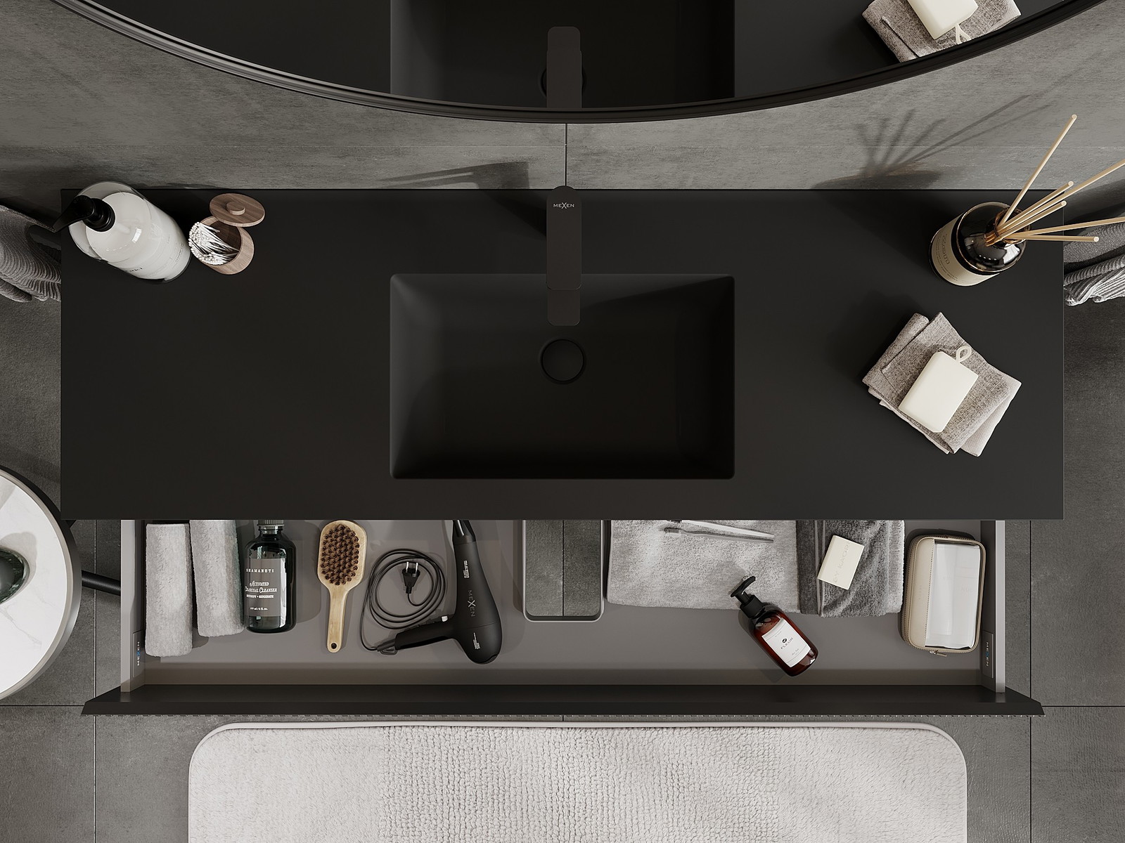 Výrez v zásuvke je navrhnutý tak, aby pojal sifón, ktorý je nevyhnutný v umývadlových inštaláciách. Vďaka tomu môže byť nábytok namontovaný plne funkčne, bez nutnosti vzdávať sa priestoru v zásuvke v prospech inštalácie.