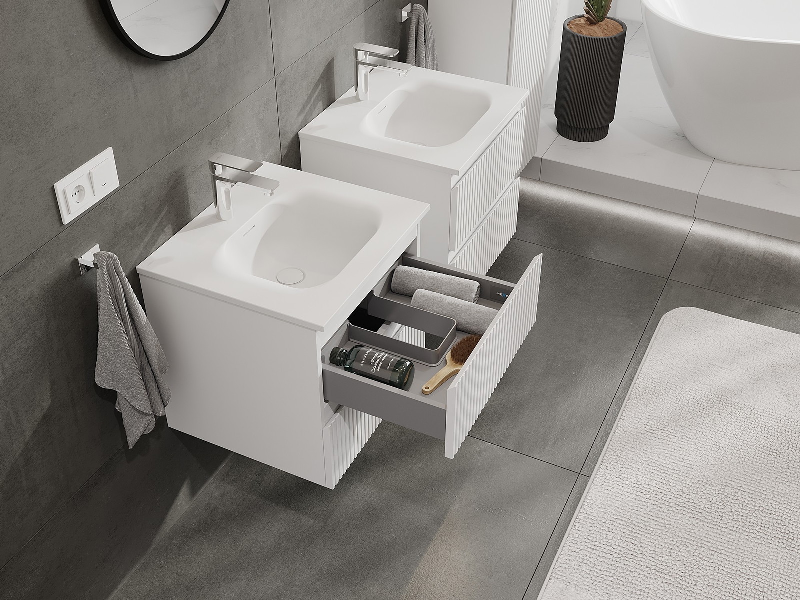 Výrez v zásuvke je navrhnutý tak, aby pojal sifón, ktorý je nevyhnutný v umývadlových inštaláciách. Vďaka tomu môže byť nábytok namontovaný plne funkčne, bez nutnosti vzdávať sa priestoru v zásuvke v prospech inštalácie.