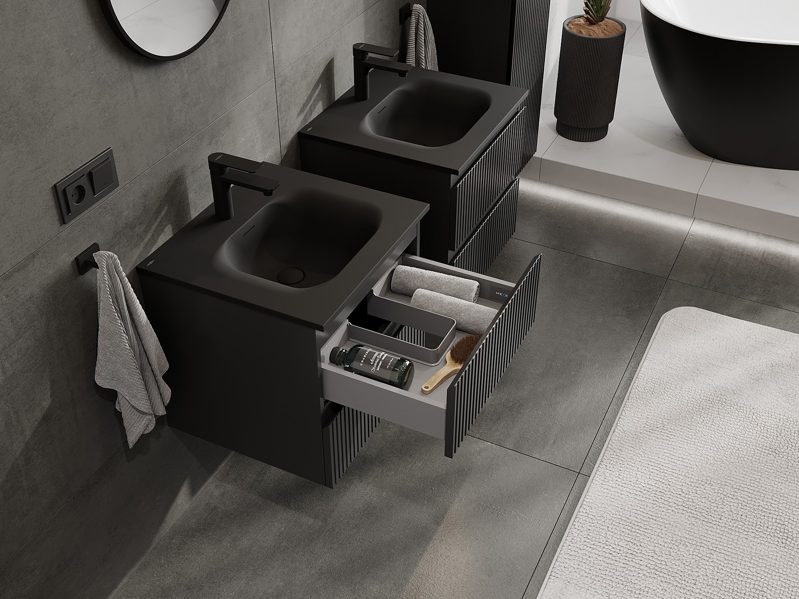 Výrez v zásuvke je navrhnutý tak, aby pojal sifón, ktorý je nevyhnutný v umývadlových inštaláciách. Vďaka tomu môže byť nábytok namontovaný plne funkčne, bez nutnosti vzdávať sa priestoru v zásuvke v prospech inštalácie.