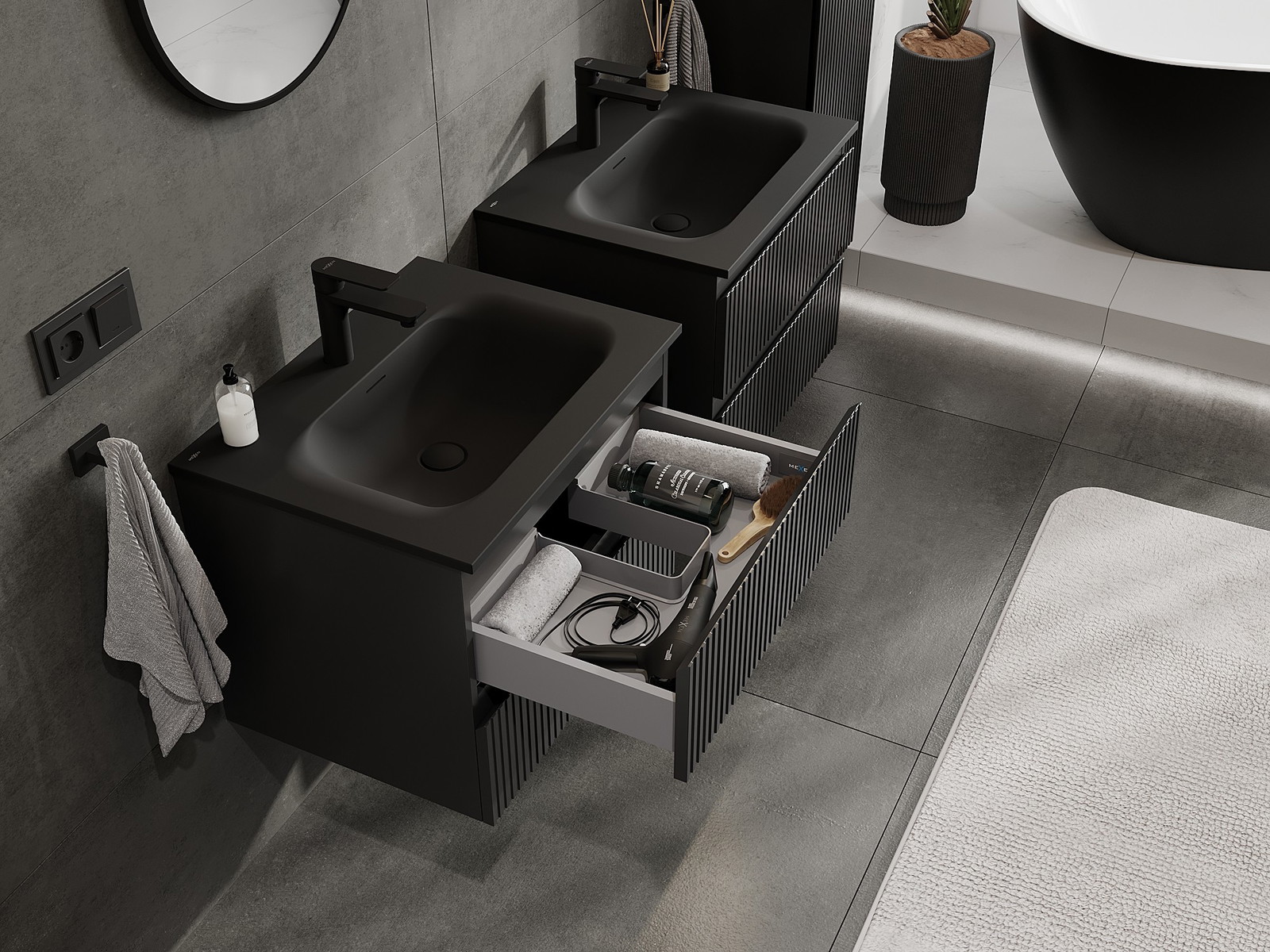 Výrez v zásuvke je navrhnutý tak, aby pojal sifón, ktorý je nevyhnutný v umývadlových inštaláciách. Vďaka tomu môže byť nábytok namontovaný plne funkčne, bez nutnosti vzdávať sa priestoru v zásuvke v prospech inštalácie.