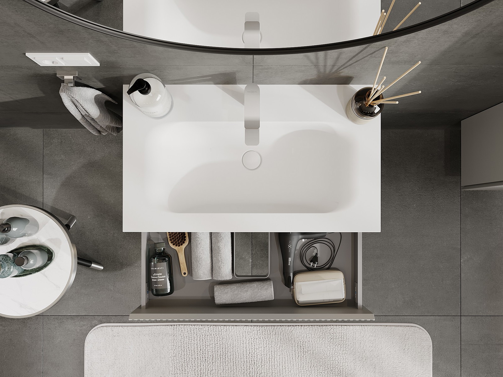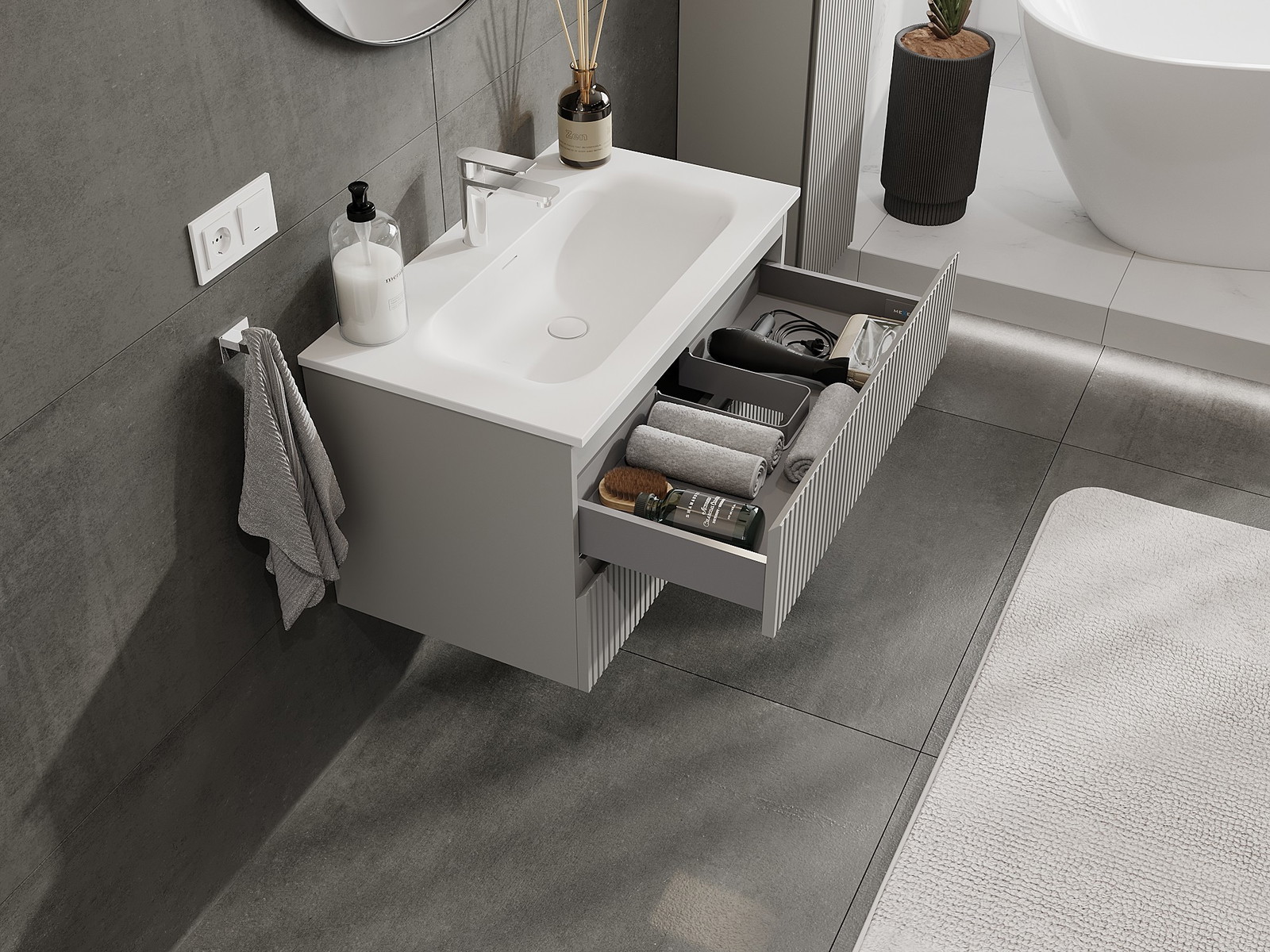 Výrez v zásuvke je navrhnutý tak, aby pojal sifón, ktorý je nevyhnutný v umývadlových inštaláciách. Vďaka tomu môže byť nábytok namontovaný plne funkčne, bez nutnosti vzdávať sa priestoru v zásuvke v prospech inštalácie.
