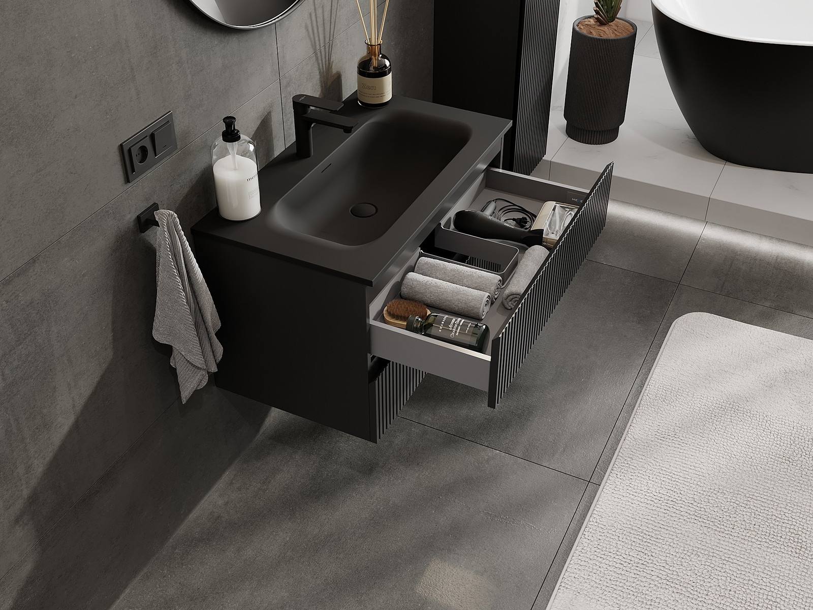 Výrez v zásuvke je navrhnutý tak, aby pojal sifón, ktorý je nevyhnutný v umývadlových inštaláciách. Vďaka tomu môže byť nábytok namontovaný plne funkčne, bez nutnosti vzdávať sa priestoru v zásuvke v prospech inštalácie.