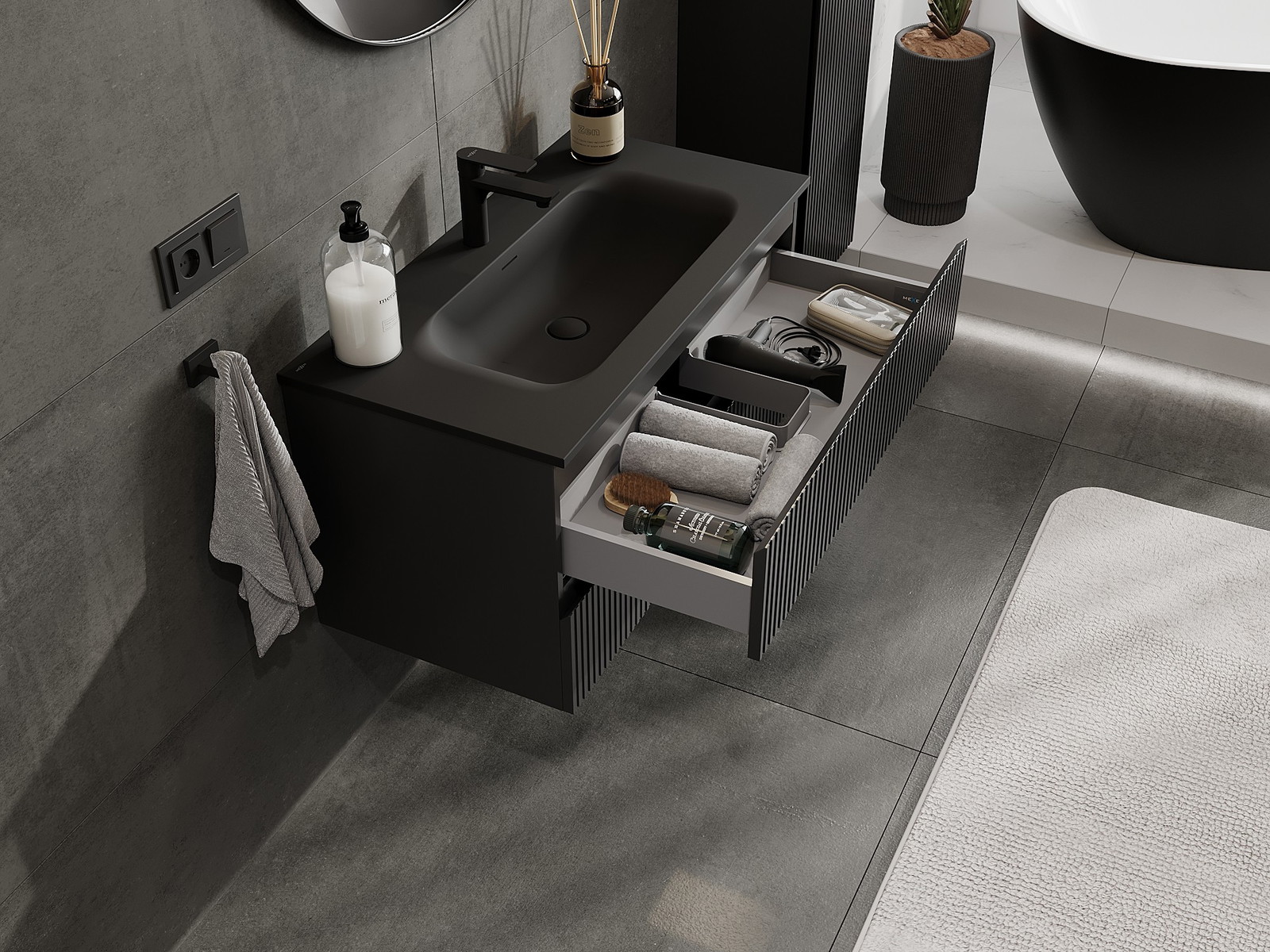Výrez v zásuvke je navrhnutý tak, aby pojal sifón, ktorý je nevyhnutný v umývadlových inštaláciách. Vďaka tomu môže byť nábytok namontovaný plne funkčne, bez nutnosti vzdávať sa priestoru v zásuvke v prospech inštalácie.