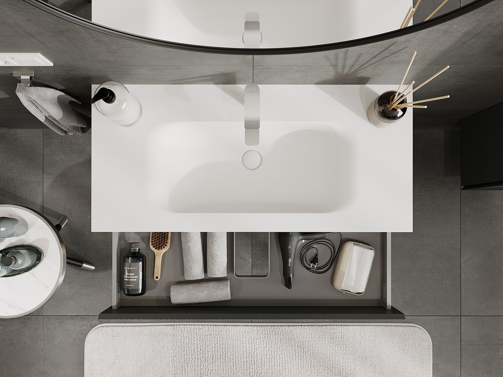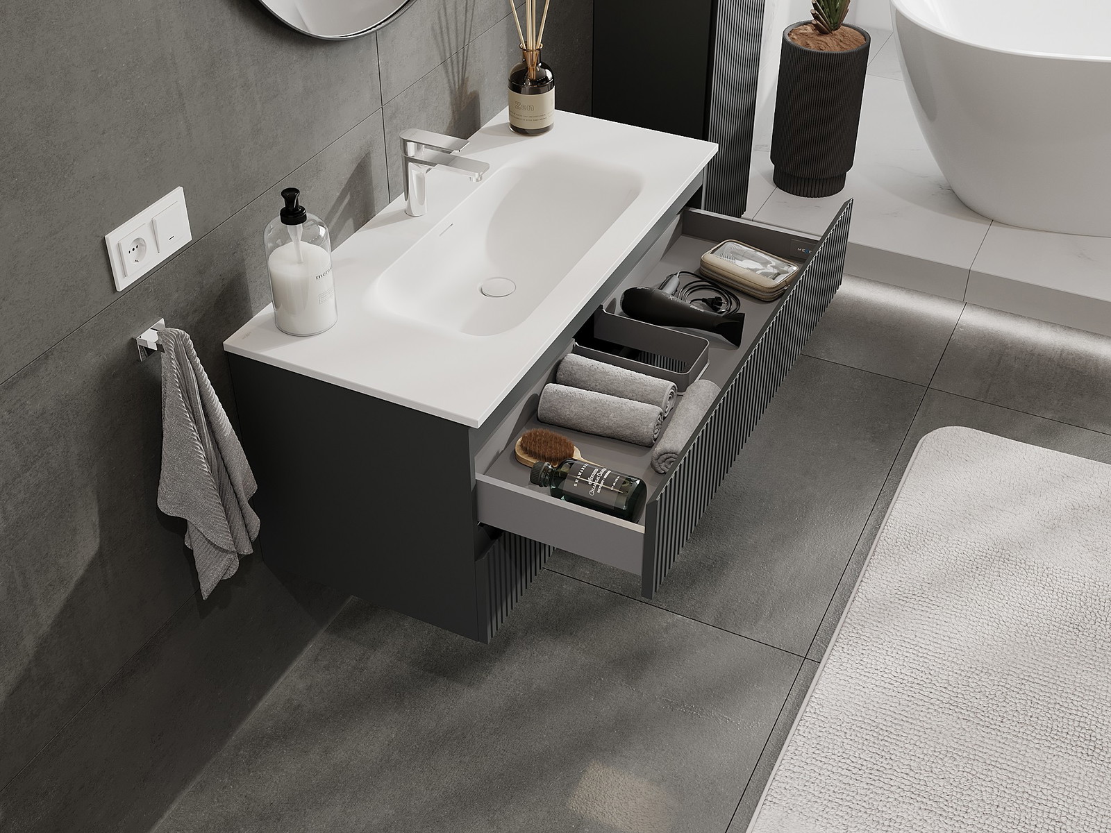 Výrez v zásuvke je navrhnutý tak, aby pojal sifón, ktorý je nevyhnutný v umývadlových inštaláciách. Vďaka tomu môže byť nábytok namontovaný plne funkčne, bez nutnosti vzdávať sa priestoru v zásuvke v prospech inštalácie.