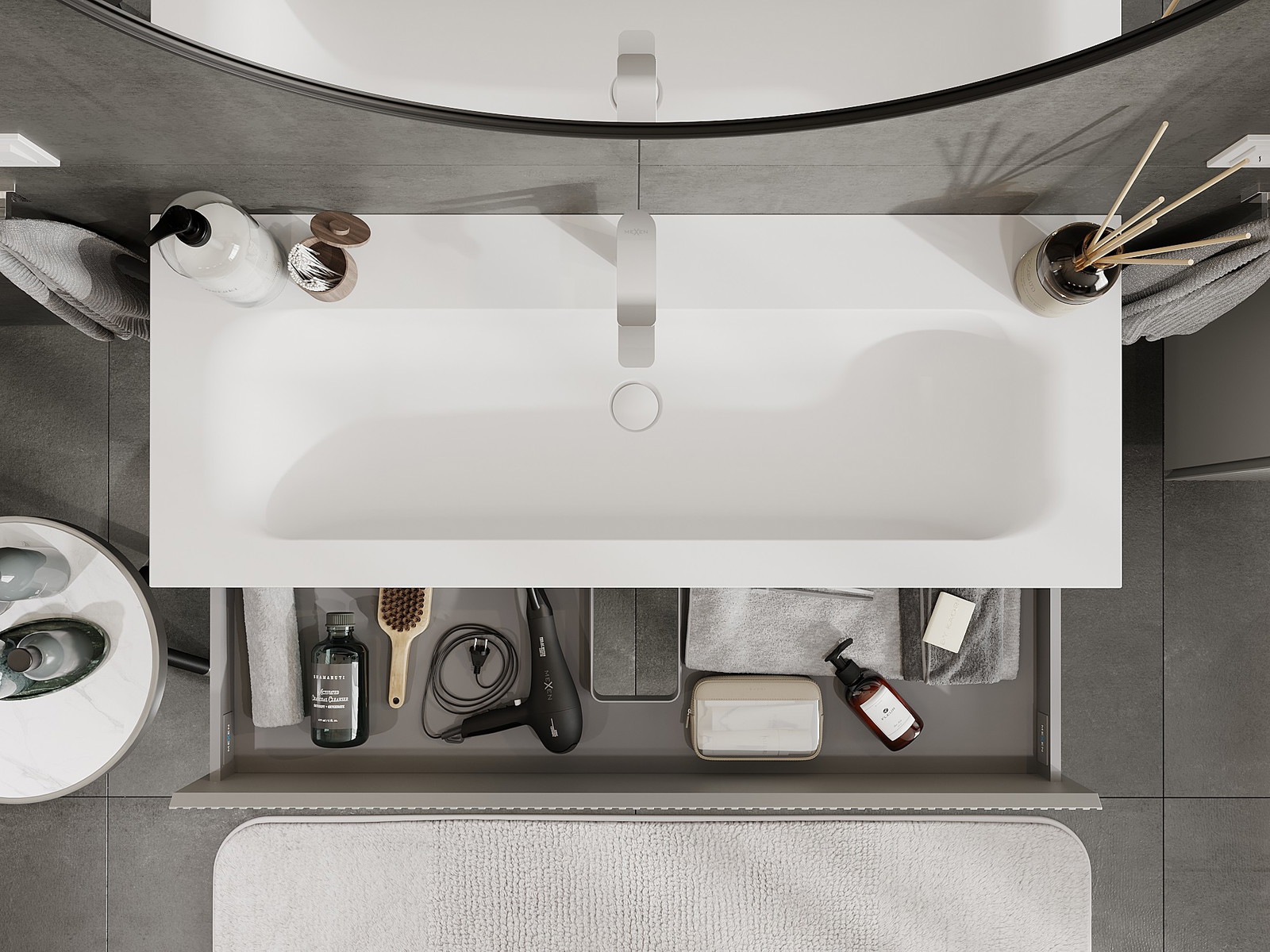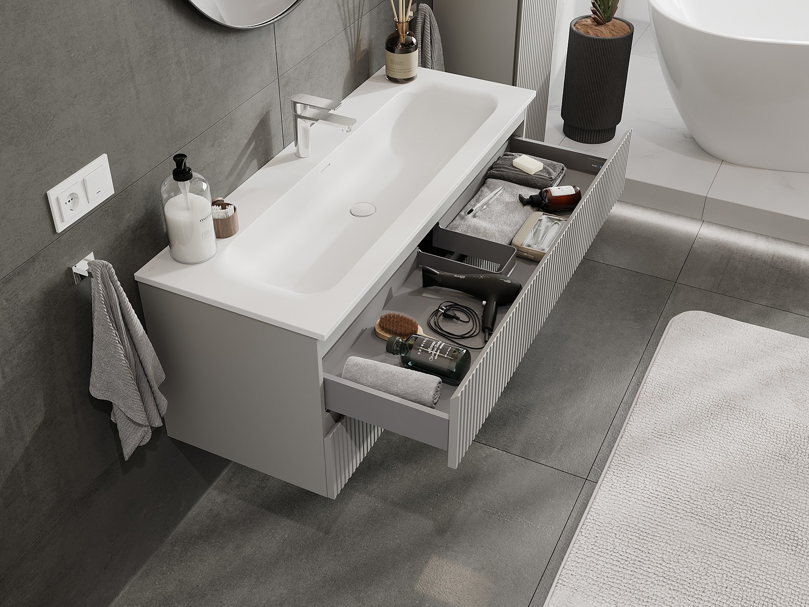 Výrez v zásuvke je navrhnutý tak, aby pojal sifón, ktorý je nevyhnutný v umývadlových inštaláciách. Vďaka tomu môže byť nábytok namontovaný plne funkčne, bez nutnosti vzdávať sa priestoru v zásuvke v prospech inštalácie.