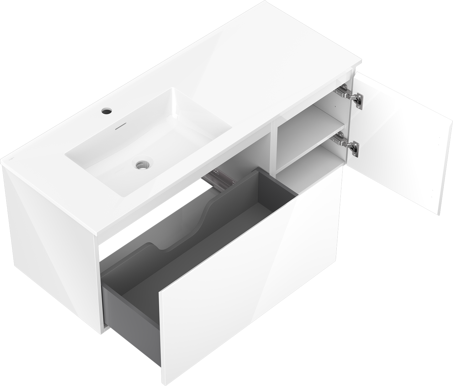 Výrez v zásuvke je navrhnutý tak, aby pojal sifón, ktorý je nevyhnutný v umývadlových inštaláciách. Vďaka tomu môže byť nábytok namontovaný plne funkčne, bez nutnosti vzdávať sa priestoru v zásuvke v prospech inštalácie.