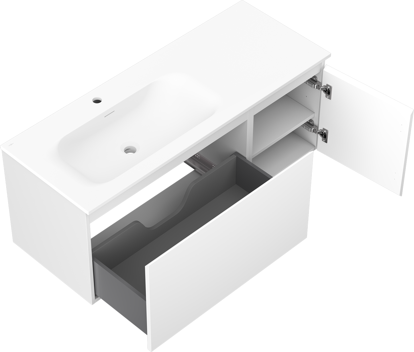 Výrez v zásuvke je navrhnutý tak, aby pojal sifón, ktorý je nevyhnutný v umývadlových inštaláciách. Vďaka tomu môže byť nábytok namontovaný plne funkčne, bez nutnosti vzdávať sa priestoru v zásuvke v prospech inštalácie.