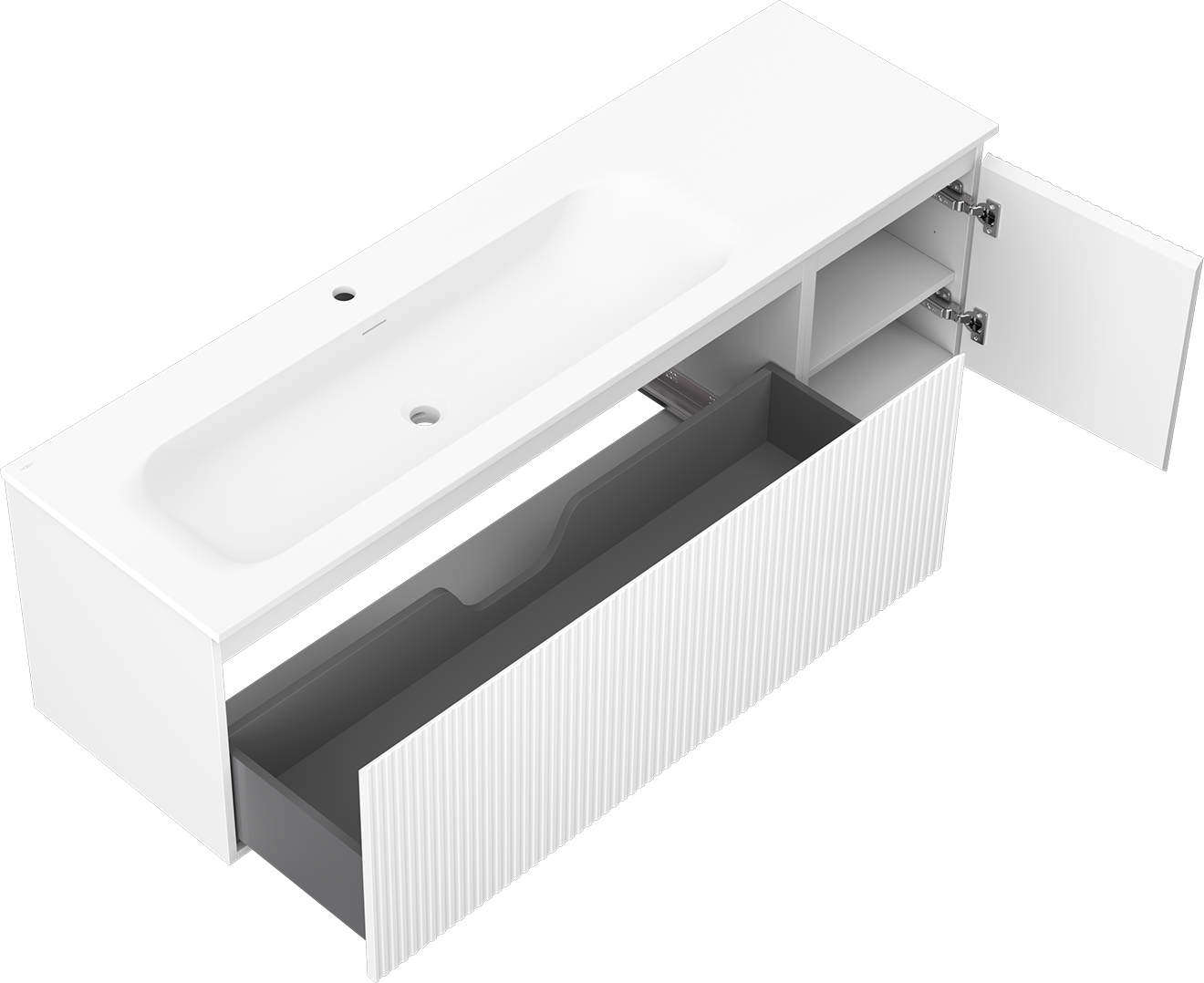 Výrez v zásuvke je navrhnutý tak, aby pojal sifón, ktorý je nevyhnutný v umývadlových inštaláciách. Vďaka tomu môže byť nábytok namontovaný plne funkčne, bez nutnosti vzdávať sa priestoru v zásuvke v prospech inštalácie.