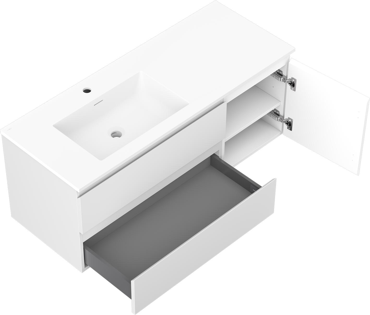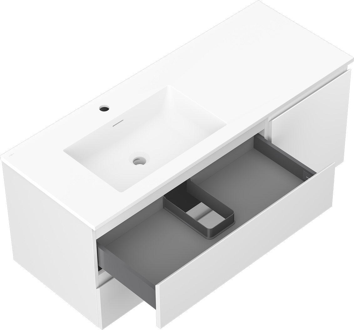 Výrez v zásuvke je navrhnutý tak, aby pojal sifón, ktorý je nevyhnutný v umývadlových inštaláciách. Vďaka tomu môže byť nábytok namontovaný plne funkčne, bez nutnosti vzdávať sa priestoru v zásuvke v prospech inštalácie.