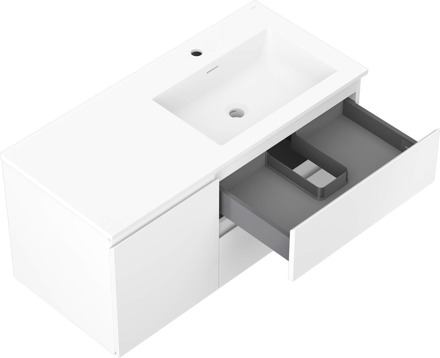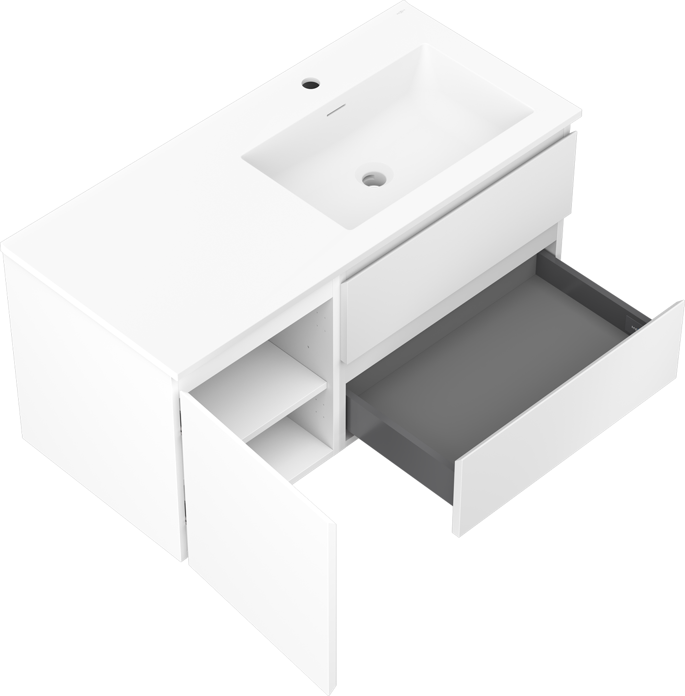 Výrez v zásuvke je navrhnutý tak, aby pojal sifón, ktorý je nevyhnutný v umývadlových inštaláciách. Vďaka tomu môže byť nábytok namontovaný plne funkčne, bez nutnosti vzdávať sa priestoru v zásuvke v prospech inštalácie.