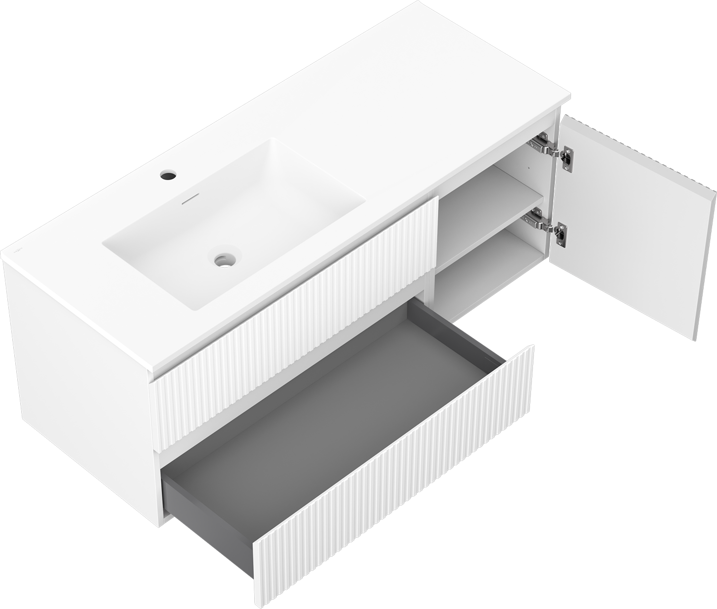 Výrez v zásuvke je navrhnutý tak, aby pojal sifón, ktorý je nevyhnutný v umývadlových inštaláciách. Vďaka tomu môže byť nábytok namontovaný plne funkčne, bez nutnosti vzdávať sa priestoru v zásuvke v prospech inštalácie.