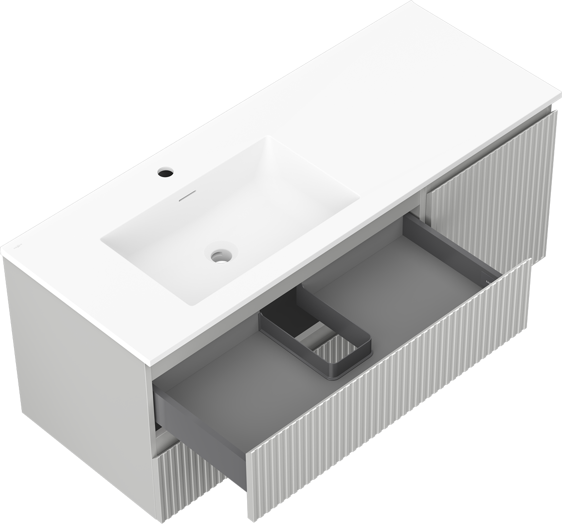 Výrez v zásuvke je navrhnutý tak, aby pojal sifón, ktorý je nevyhnutný v umývadlových inštaláciách. Vďaka tomu môže byť nábytok namontovaný plne funkčne, bez nutnosti vzdávať sa priestoru v zásuvke v prospech inštalácie.