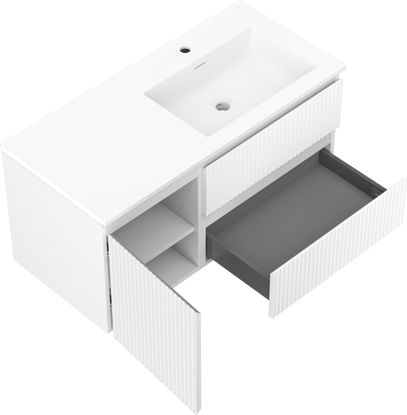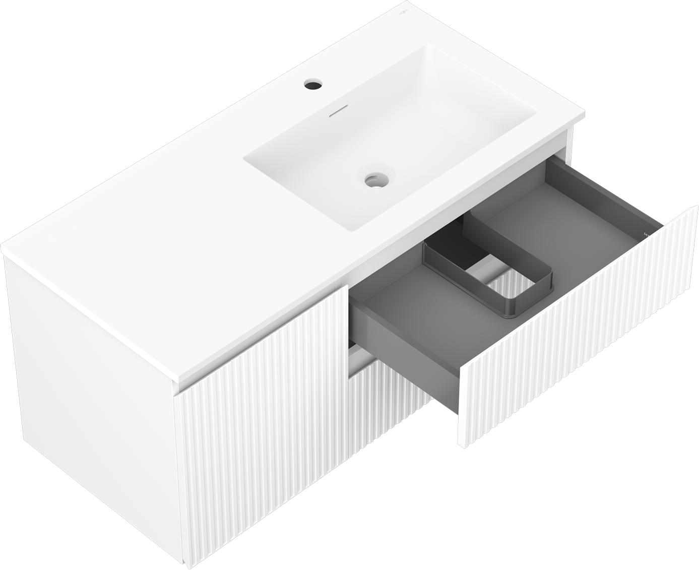 Výrez v zásuvke je navrhnutý tak, aby pojal sifón, ktorý je nevyhnutný v umývadlových inštaláciách. Vďaka tomu môže byť nábytok namontovaný plne funkčne, bez nutnosti vzdávať sa priestoru v zásuvke v prospech inštalácie.