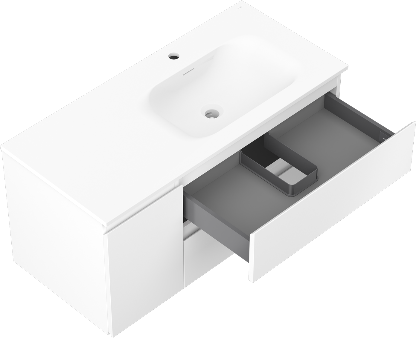 Výrez v zásuvke je navrhnutý tak, aby pojal sifón, ktorý je nevyhnutný v umývadlových inštaláciách. Vďaka tomu môže byť nábytok namontovaný plne funkčne, bez nutnosti vzdávať sa priestoru v zásuvke v prospech inštalácie.