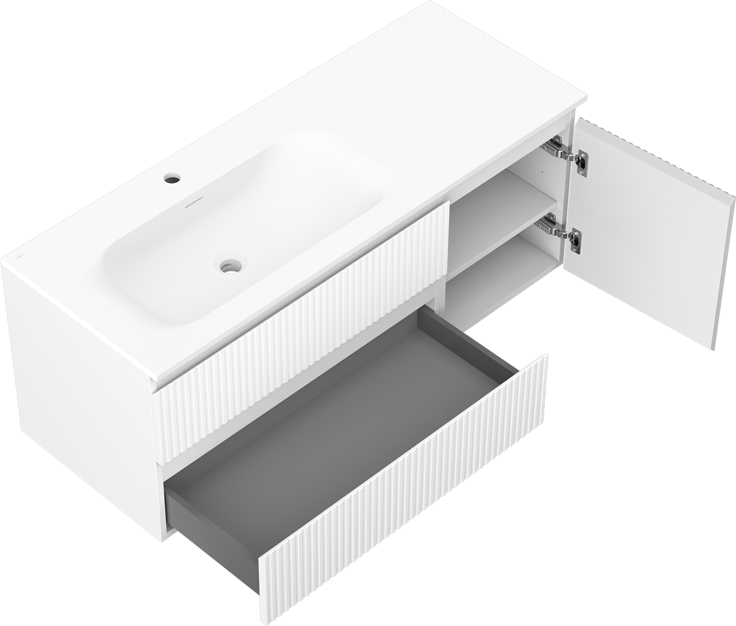 Výrez v zásuvke je navrhnutý tak, aby pojal sifón, ktorý je nevyhnutný v umývadlových inštaláciách. Vďaka tomu môže byť nábytok namontovaný plne funkčne, bez nutnosti vzdávať sa priestoru v zásuvke v prospech inštalácie.