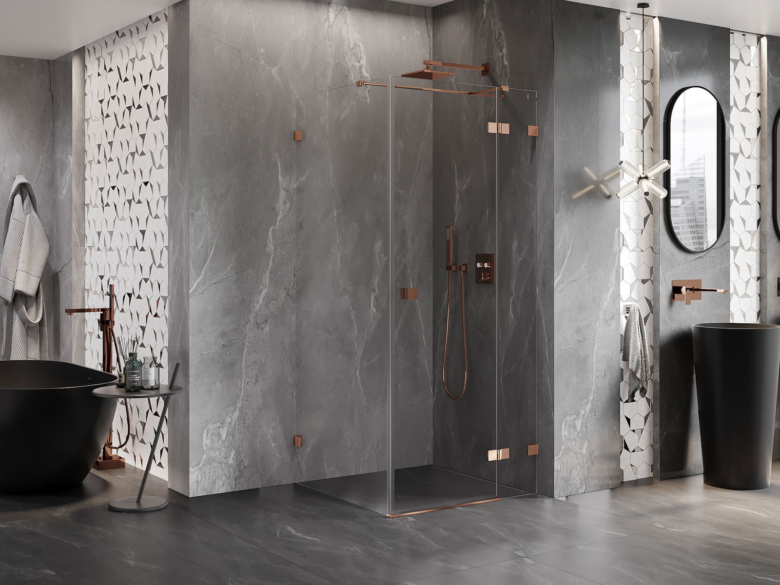 Praktická a pohodlná rukoväť je vyrobená z odolného a pevného kovu. Moderný tvar v kombinácii s povrchovou úpravou prispôsobenou farbe profilov dodáva celku moderný a štýlový vzhľad, zdôrazňujúc estetiku každej kúpeľne.