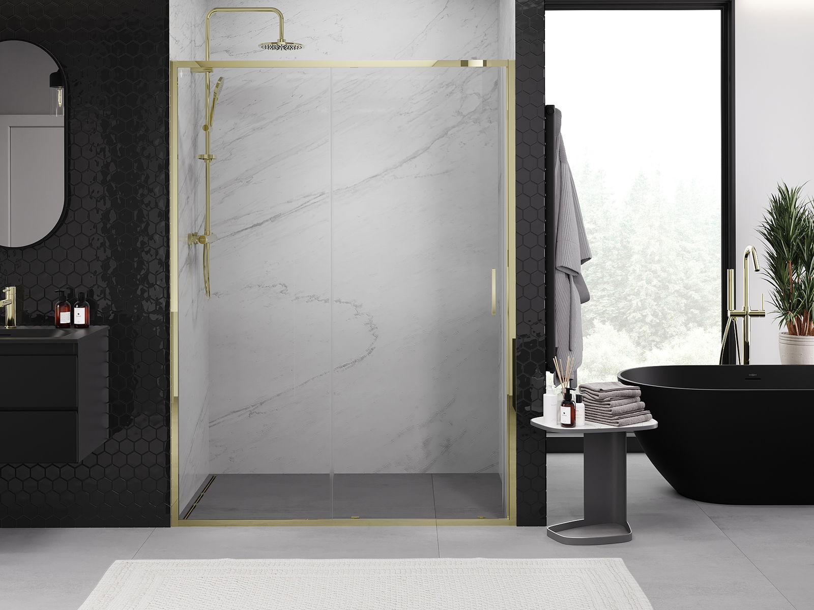 Posuvné dvere sa pohybujú po špeciálnych koľajniciach a nevyžadujú dodatočný priestor na otvorenie, preto sú ideálne pre menšie kúpeľne. Vďaka dvojitým kolieskam s kovovým telom je ich pohyb plynulý.