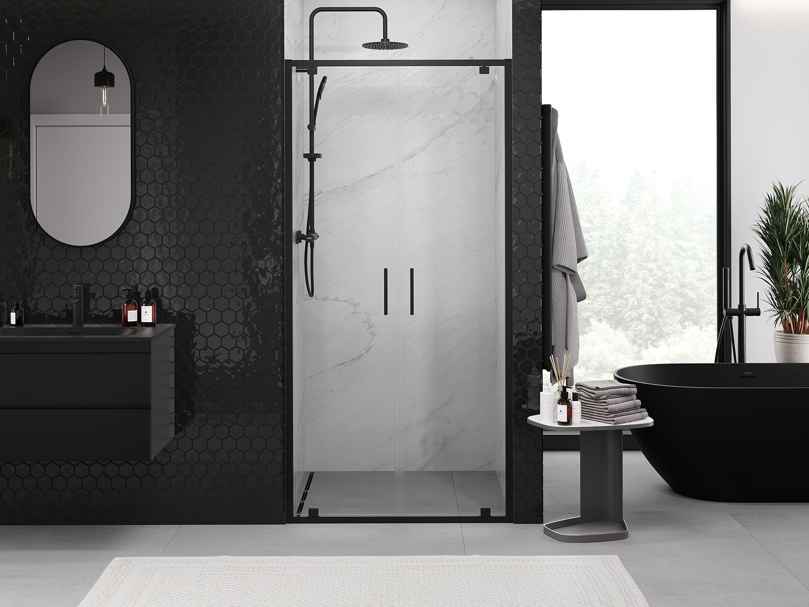 Praktická a pohodlná rukoväť je vyrobená z odolného a pevného kovu. Moderný tvar v kombinácii s povrchovou úpravou prispôsobenou farbe profilov dodáva celku moderný a štýlový vzhľad, zdôrazňujúc estetiku každej kúpeľne.