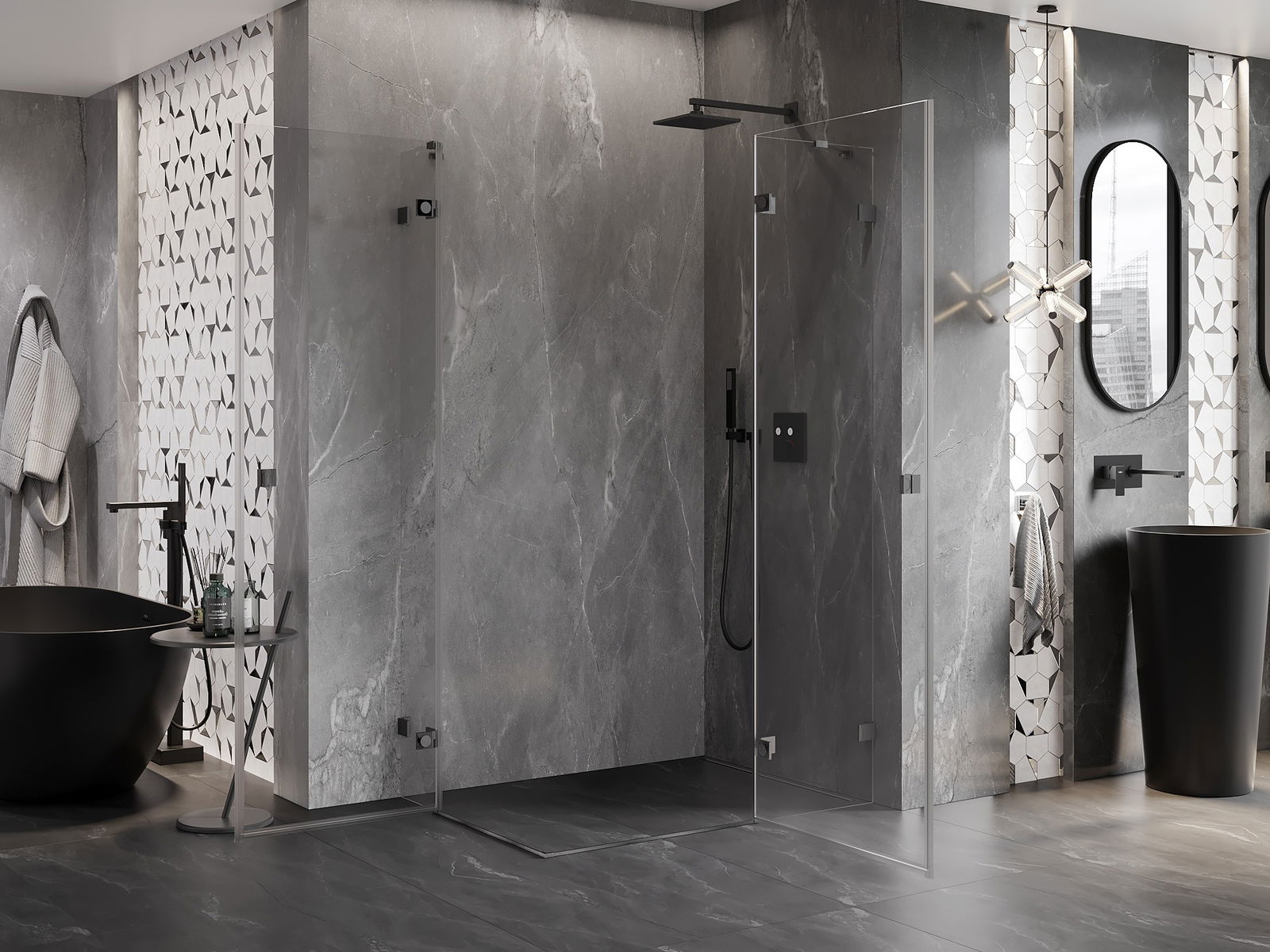 Praktická a pohodlná rukoväť je vyrobená z odolného a pevného kovu. Moderný tvar v kombinácii s povrchovou úpravou prispôsobenou farbe profilov dodáva celku moderný a štýlový vzhľad, zdôrazňujúc estetiku každej kúpeľne.