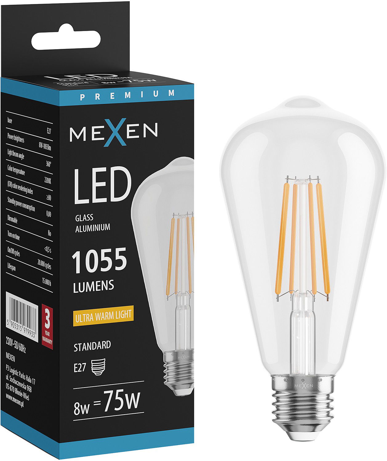 Mexen Vintis Filamentová LED žiarovka E27, ST64, 8W, Teplá - 2200K, 1055 lm, číra - L152-E27-0822-00