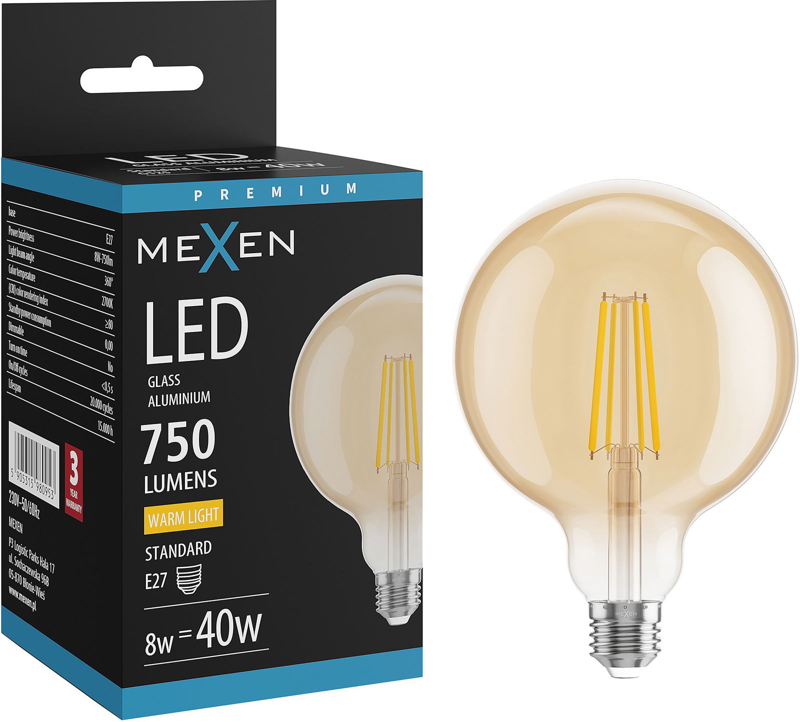 Mexen Vintis LED žiarovka s vláknom E27, G125, 8W, Teplá - 2700K, 750 lm, jantárová - L158-E27-0827-50