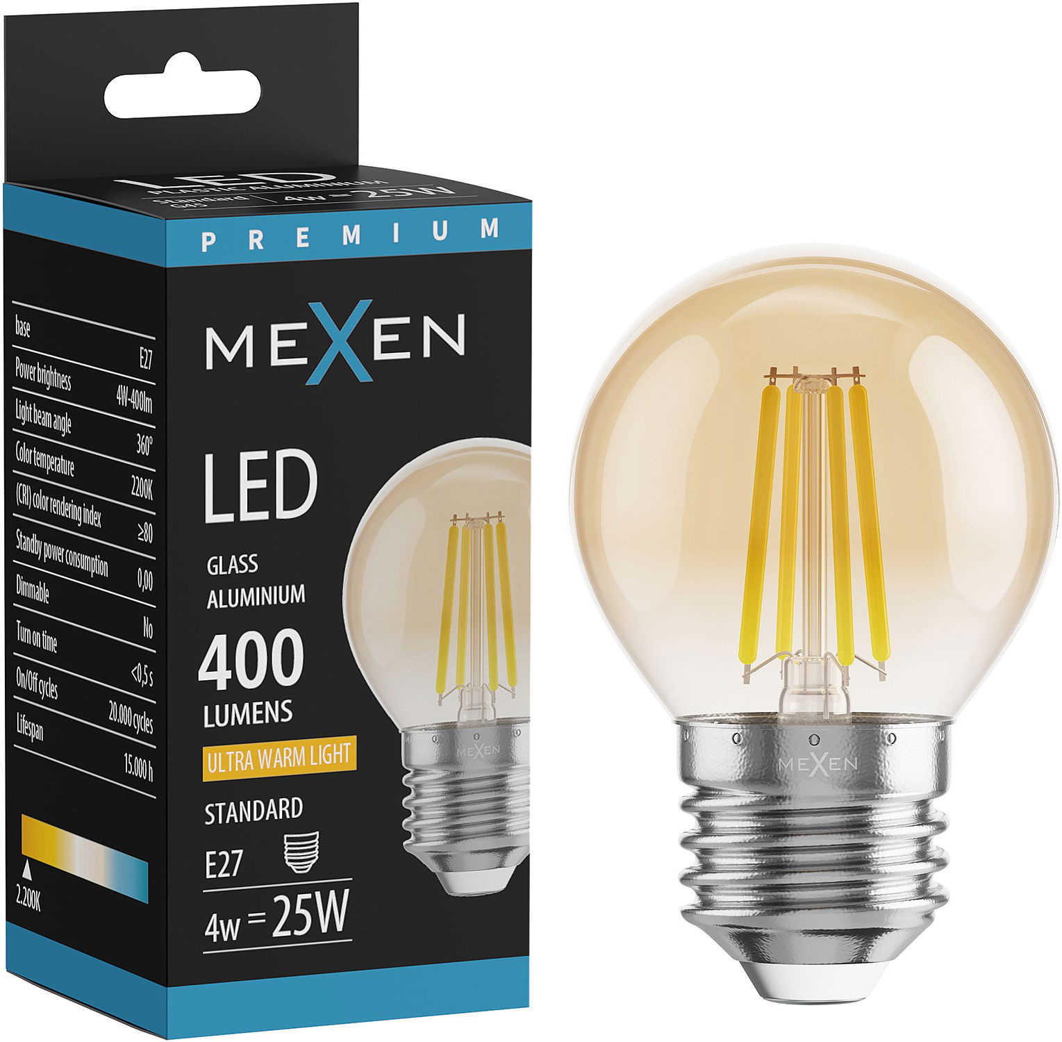 Mexen Vintis LED žiarovka s vláknom E27, G45, 4W, Teplá - 2200K, 400 lm, jantárová - L156-E27-0422-50