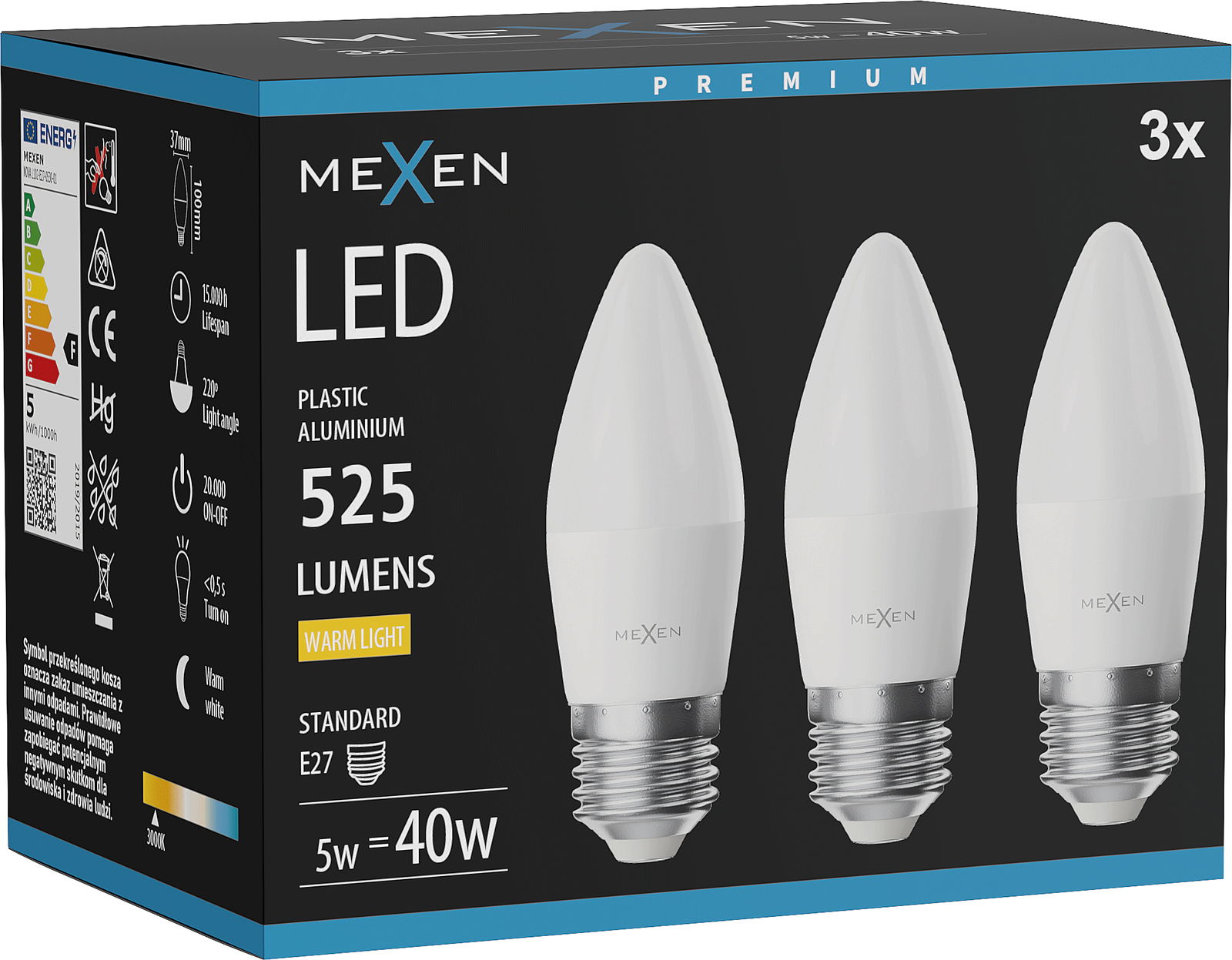 Mexen Nova 3x LED žiarovka E27, C37, 5W, Teplá - 3000K, 525 lm - L102-E27-0530-01x03