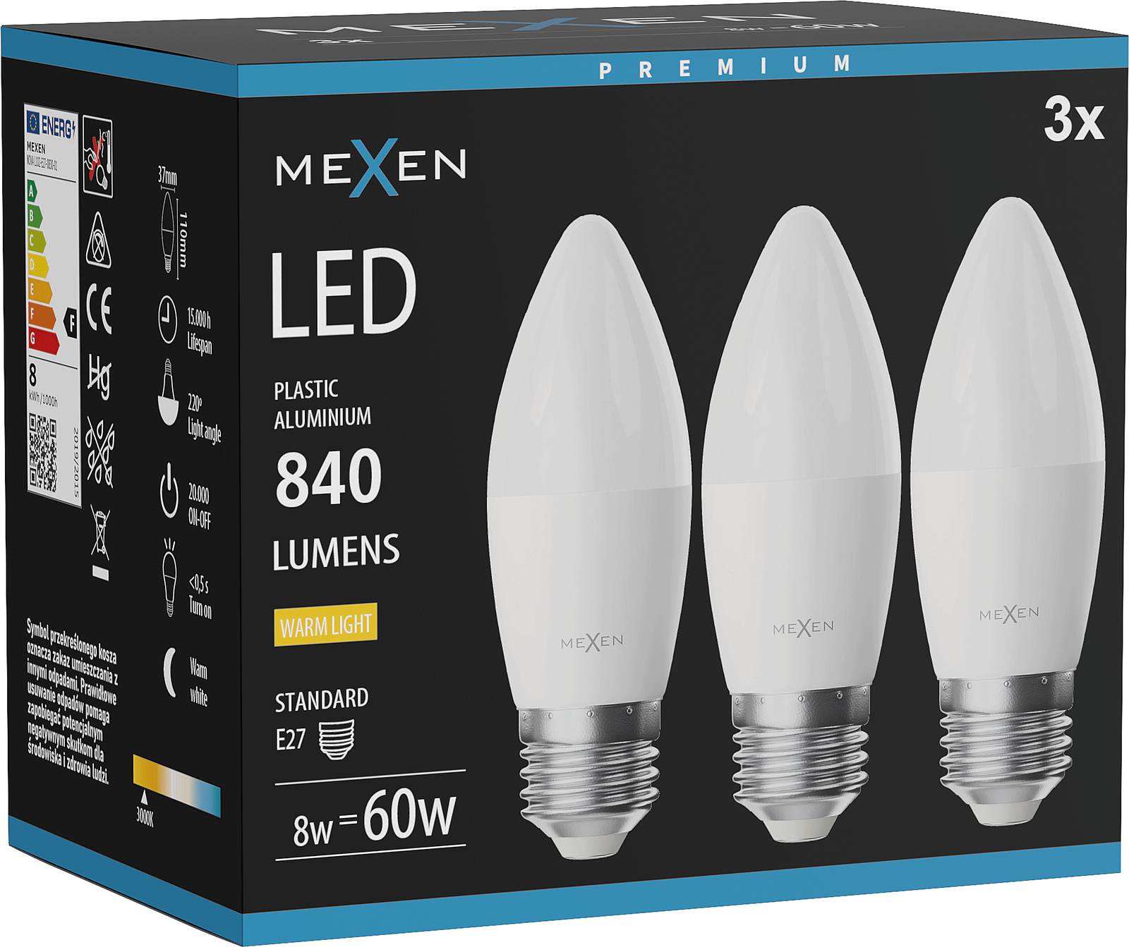 Mexen Nova 3x Žiarovka LED E27, C37, 8W, Teplá - 3000K, 840 lm - L102-E27-0830-01x03