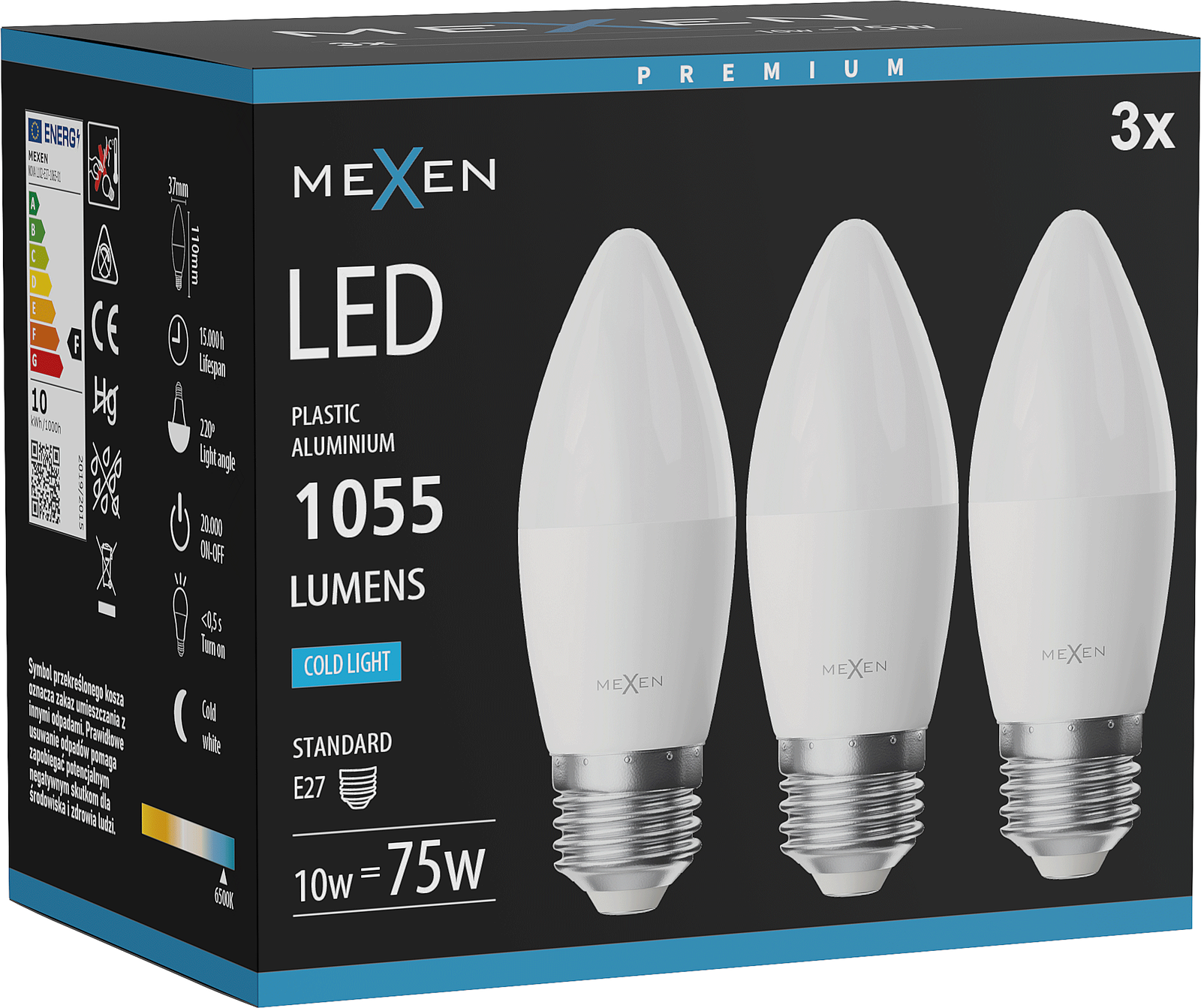 Mexen Nova 3x LED žiarovka E27, C37, 10W, Studená - 6500K, 1055 lm - L102-E27-1065-01x03