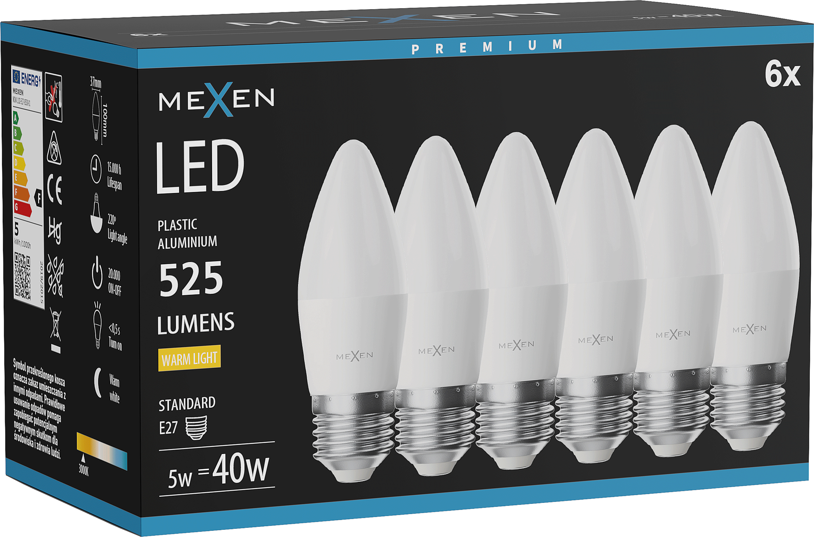 Mexen Nova 6x Žiarovka LED E27, C37, 5W, Teplá - 3000K, 525 lm - L102-E27-0530-01x06