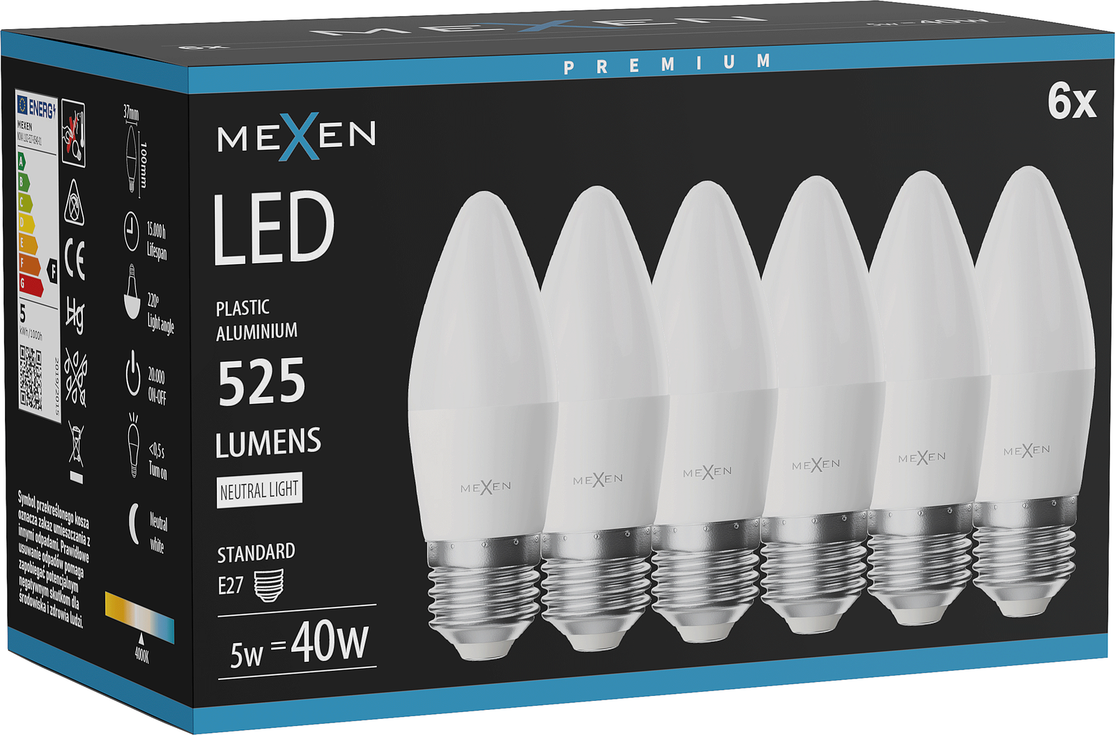 Mexen Nova 6x LED žiarovka E27, C37, 5W, Neutrálna - 4000K, 525 lm - L102-E27-0540-01x06