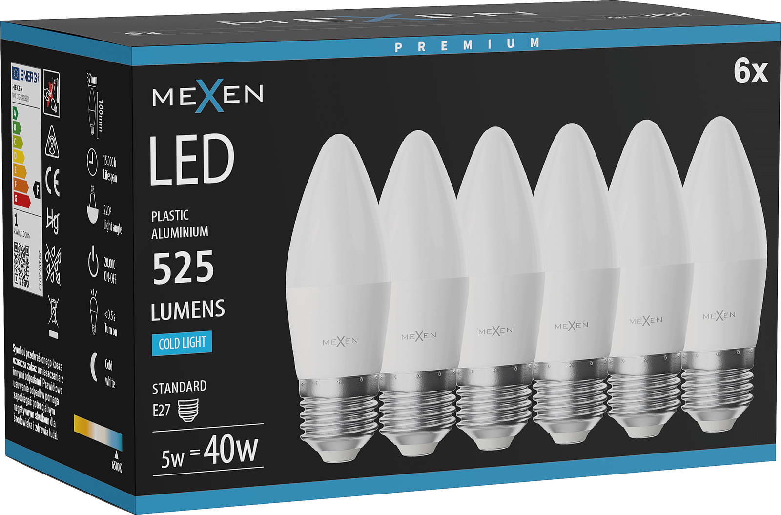 Mexen Nova 6x LED žiarovka E27, C37, 5W, Studená - 6500K, 525 lm - L102-E27-0565-01x06