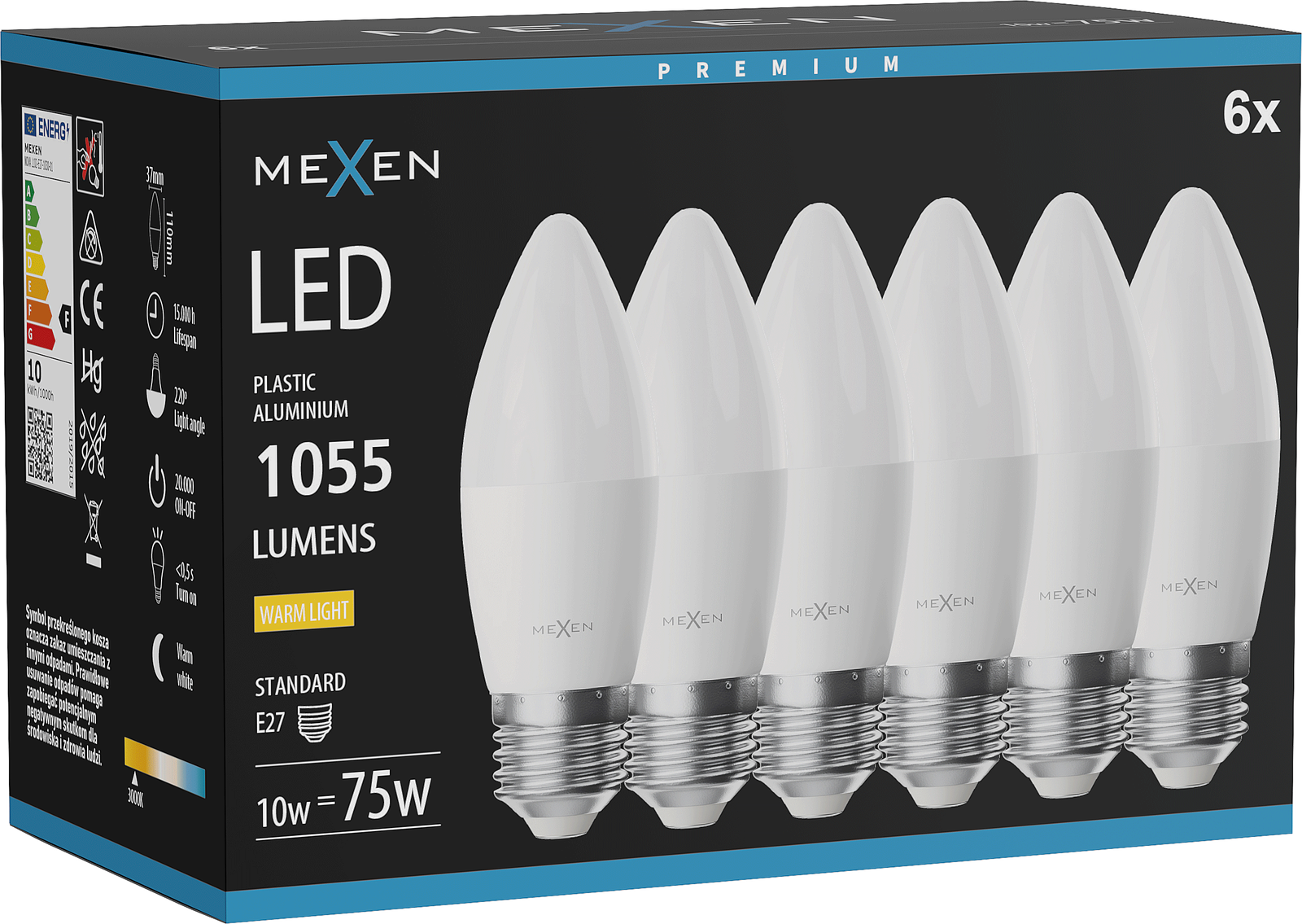 Mexen Nova 6x Žiarovka LED E27, C37, 10W, Teplá - 3000K, 1055 lm - L102-E27-1030-01x06