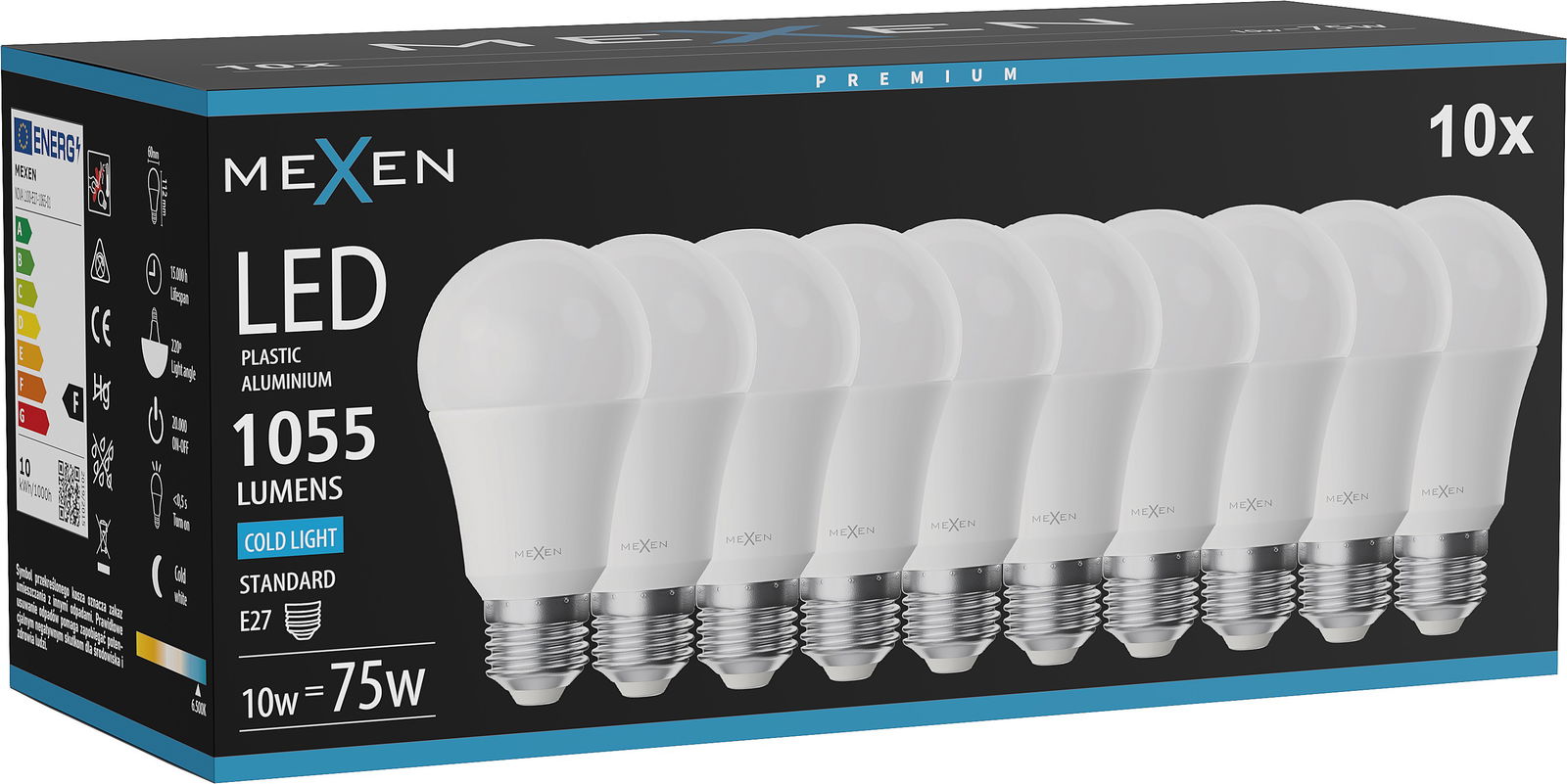 Mexen Nova 10x LED žiarovka E27, A60, 10W, Studená - 6500K, 1055 lm - L100-E27-1065-01x10
