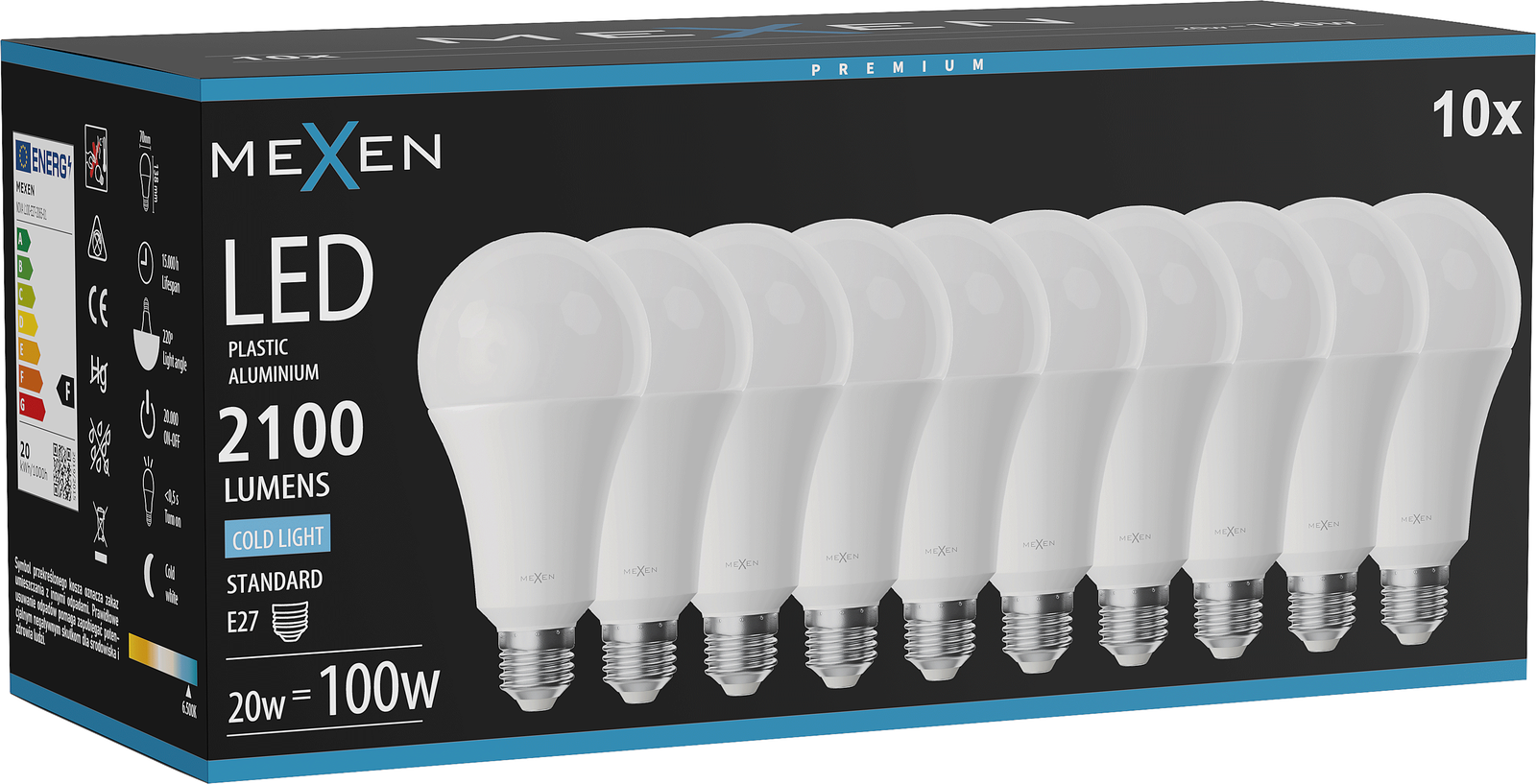Mexen Nova 10x LED žiarovka E27, A70, 20W, Studená - 6500K, 2100 lm - L100-E27-2065-01x10