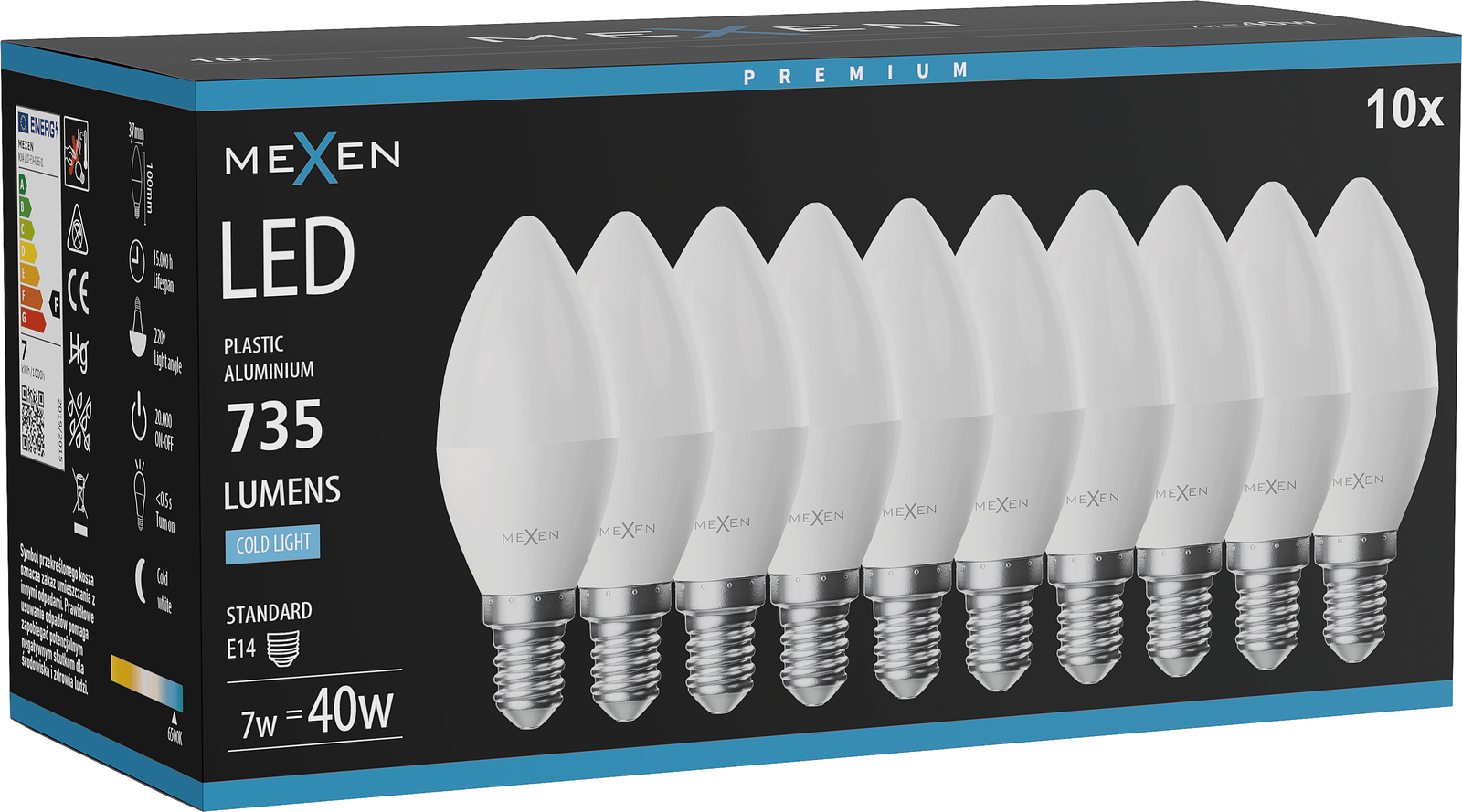 Mexen Nova 10x LED žiarovka E14, C37, 7W, Studená - 6500K, 735 lm - L102-E14-0765-01x10