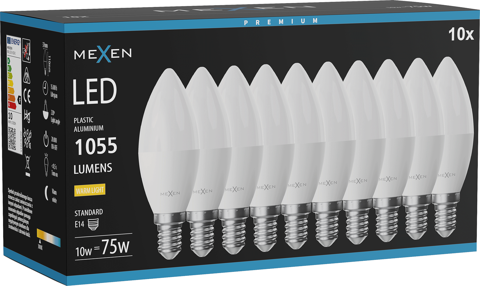 Mexen Nova 10x LED žiarovka E14, C37, 10W, Teplá - 3000K, 1055 lm - L102-E14-1030-01x10