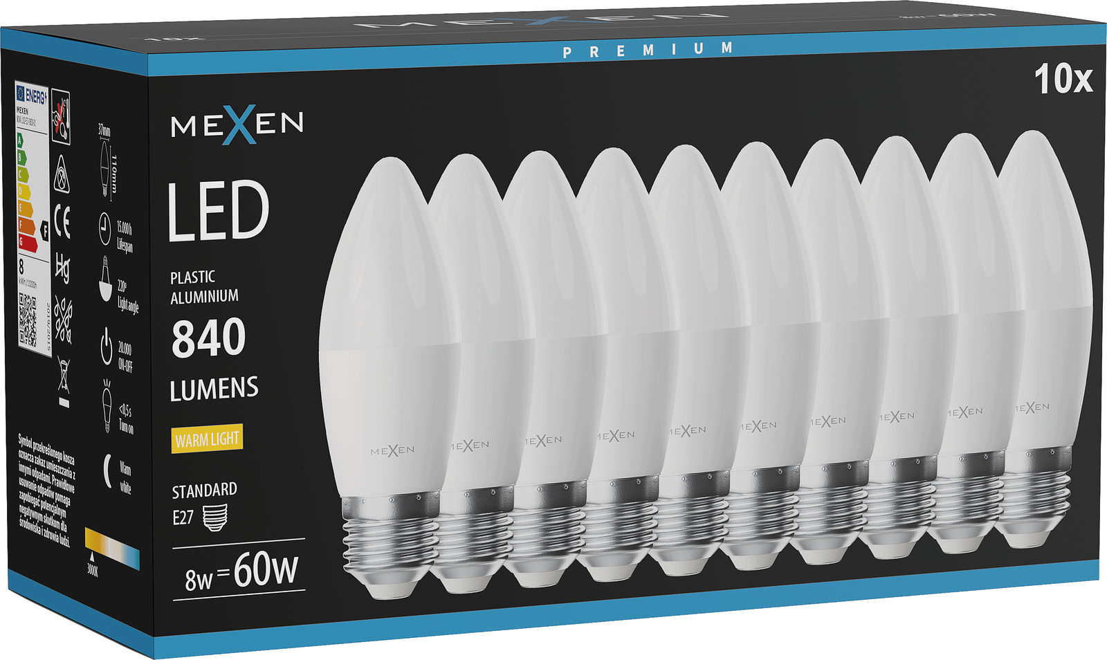 Mexen Nova 10x LED žiarovka E27, C37, 8W, Teplá - 3000K, 840 lm - L102-E27-0830-01x10