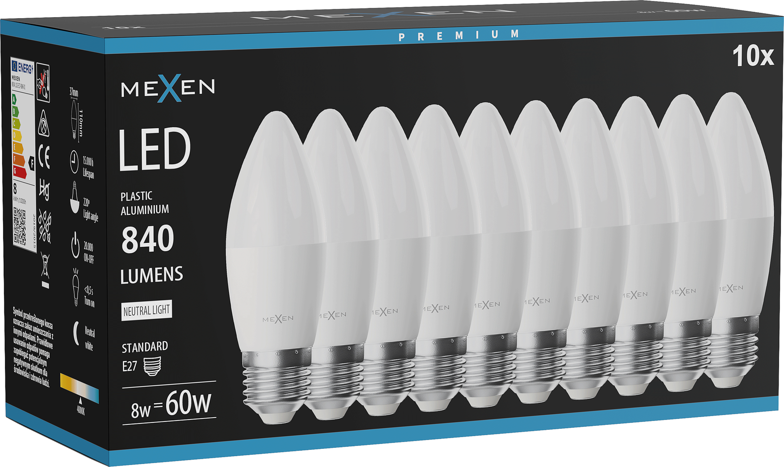 Mexen Nova 10x LED žiarovka E27, C37, 8W, Neutrálna - 4000K, 840 lm - L102-E27-0840-01x10