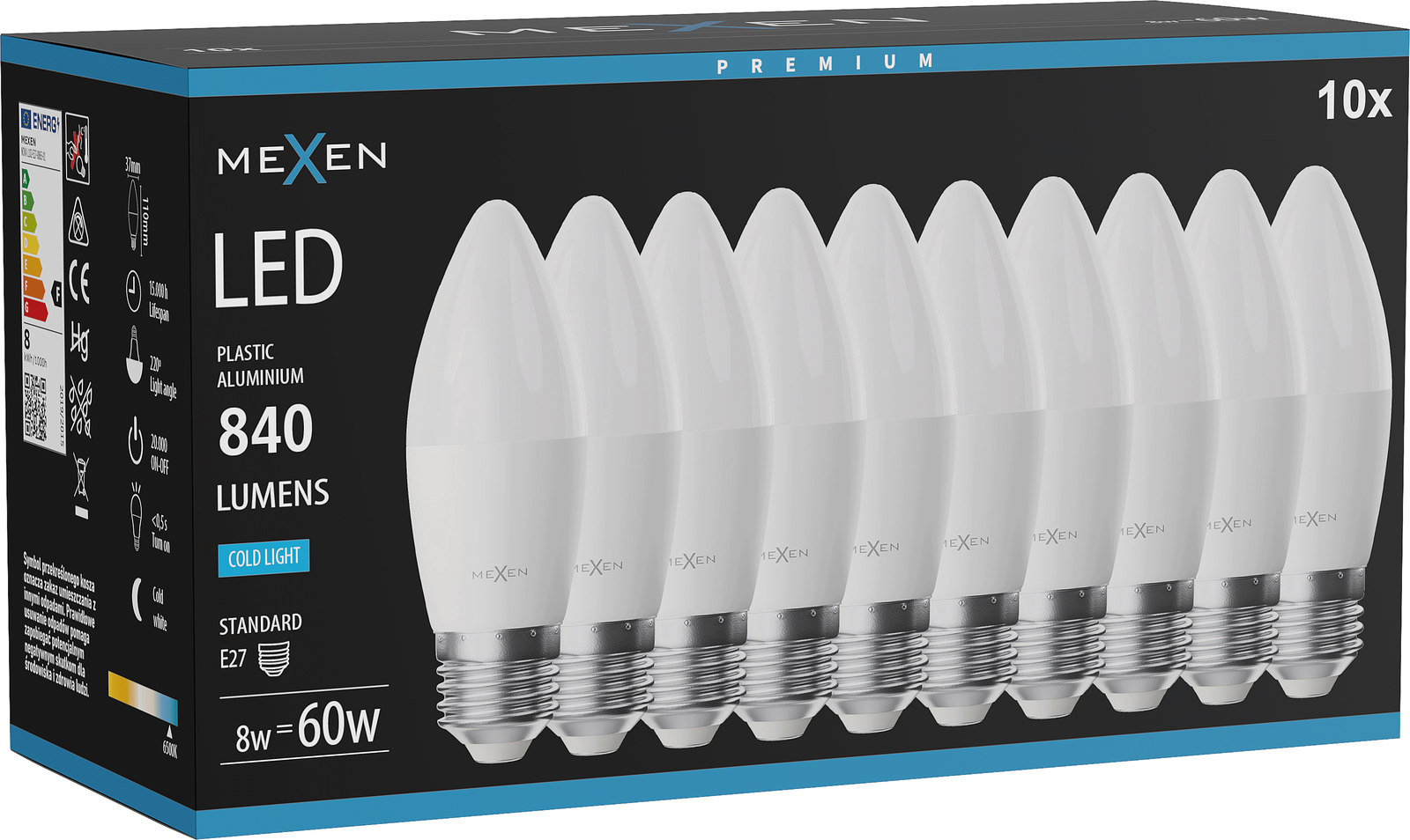Mexen Nova 10x LED žiarovka E27, C37, 8W, Studená - 6500K, 840 lm - L102-E27-0865-01x10