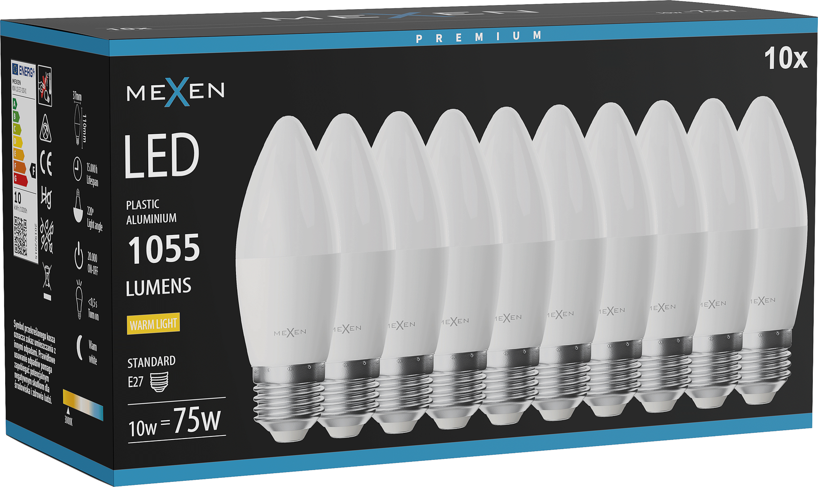 Mexen Nova 10x LED žiarovka E27, C37, 10W, Teplá - 3000K, 1055 lm - L102-E27-1030-01x10