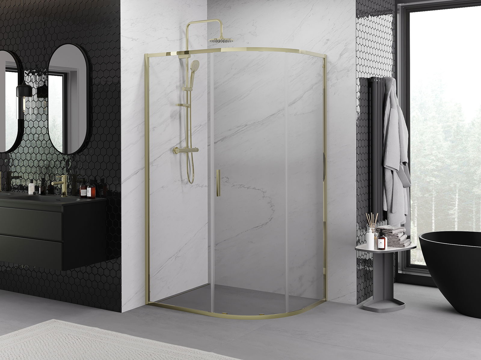 Mexen Exo asymetrická polkruhová sprchová kabína s posuvnými dverami 120 x 80 cm, priehľadná, zlatá - 8131-120-080-50-00