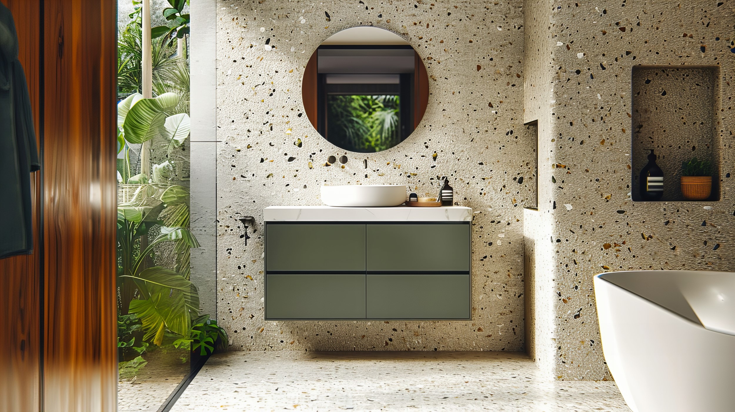 Terrazzo v kúpeľni je nadčasovým, módnym riešením, ktoré vyzerá skvelo v kombinácii s drevom, hladkými dlaždicami, ako aj sklenými povrchmi. Vďaka jeho univerzálnosti v interiérovej úprave ľahko dosiahnete požadovaný efekt.